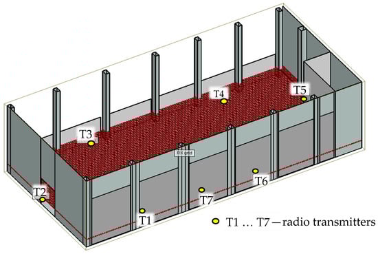 To generate a simulated RSSI distribution for use as reference data for a location algorithm, it is necessary to provide information on the locations of the transmitters in the building and the arrangement of walls, windows, doors, and other objects. Since the electromagnetic properties of structural elements are typically challenging to acquire, in our simulations we used typical values taken from ITU recommendations [36,37].