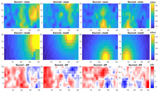 Comparison of reference RSSI maps created by measurements and simulations using the ray tracing method. Row 1—measurement data. Row 2—distributions generated by ray tracing. Row 3 is the result of calculating the subtraction between these maps presented on the spatial map.