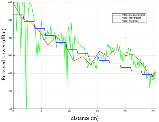- Two popular propagation models, multiwall and ray tracing, were used to create simulated RSSI datasets from floor plans representing three very different indoor environments: a sports hall, an office building, and a long corridor. RSSI measurements were also made using a smartphone. Differences between the simulated and measured RSSI maps are presented and discussed.
