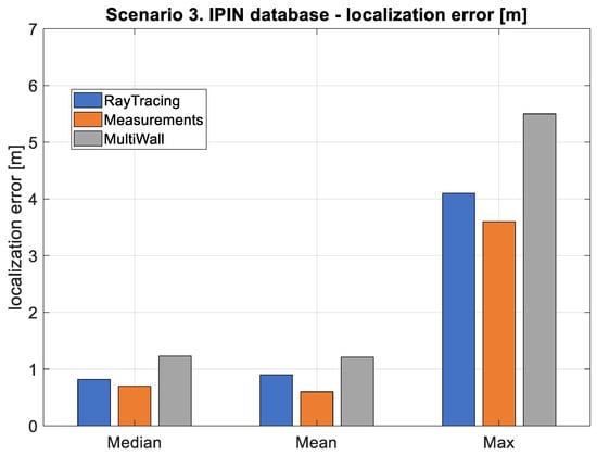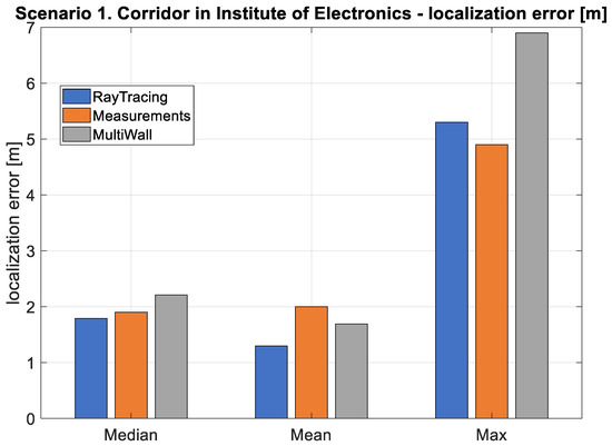In the third scenario (S3), the smallest error resulted when the calculations were made using interpolated measurement data (Figure 18). The mean error and the median error were about 1 m. The maximum error was around 3.5–5.5 m. The highest localization error occurred for the multiwall method.