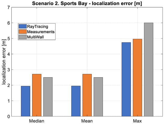 The second scenario (S2) produced similar results. The smallest median error and lowest mean error were measured for the ray tracing method (Figure 17). In this scenario, the highest maximum error occurred for the multiwall model.