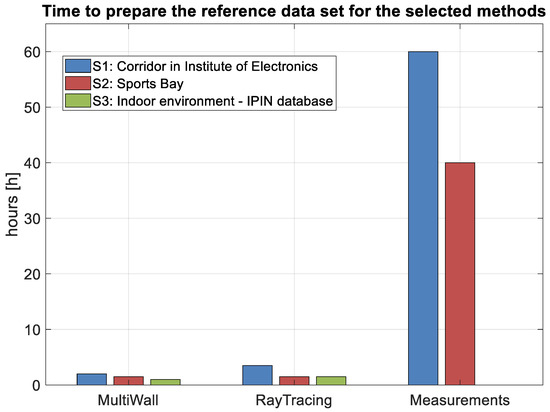 The time needed to prepare measured reference RSSI maps was one or two orders of magnitude greater than the time needed for computer simulations (Figure 19). The time required to construct reference maps using crowdsourcing with the interpolation approach described in [29] was 3 h. The use of computer simulations can further decrease the time required to prepare reference maps. In the case of the multiwall model, it required around 1–2 h to prepare the floor plan, set up the simulation environment, and generate the output, whereas, in the case of ray tracing, these tasks took 1.5–3.5 h, depending on the scenario.