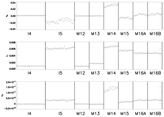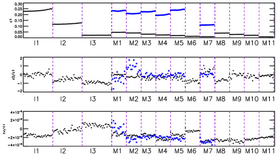 The nonlinear term (here defined as ) is also small for most bands, on the order of . There is some detector dependence in the low-gain bands M1–M3; this may result from the use of the high-radiance source instead of the standard integrating sphere. The nonlinear term is plotted in the lower panel of Figure 1. Again, black and blue denote the high- and low-gain offsets, respectively. Variation with instrument conditions (instrument temperature or electronic side) were small. The small size of the nonlinear terms for JPSS-3 indicates that there is no significant nonlinearity. On JPSS-1, nonlinearity was observed for the SWIR bands due to a hardware problem (see [14]); for JPSS-2, the hardware was corrected, and the nonlinearity was not observed. This coefficient ratio and , together with the temperature sensitivity parameters, will be used to derive the parameter tables that will be employed in the on-orbit calibration.