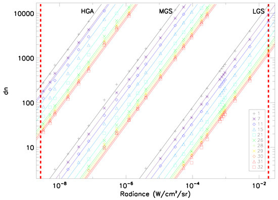 Because the DNB FPA is cooled, the final radiometric calibration of the DNB was made during environmental testing at the sensor level [15,16]. The DNB radiometric calibration requires two offset tables and a linear coefficient. One offset table is applied in the flight software and the second table is applied in the ground calibration. The onboard table is intended to flat-field the DNB to a set target value which allows the gain selection and radiation detection algorithms to operate whilst the ground table removes any remaining offset. The linear coefficient then relates the calibrated radiance to the digital counts.