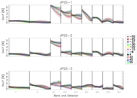 VIIRS DoLP per band and detector, across scan angles (symbols), for JPSS-1, JPSS-2, and JPSS-3 (top to bottom panels).