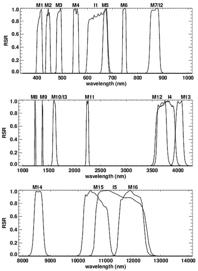 The VIIRS instrument is a cross-track scanning filter radiometer that can image the Earth twice daily from low Earth orbit (using a polar orbit with an altitude of about 830 km, a 1:30 p.m. equatorial crossing time, and an orbital period of about 100 min) [1,2]. VIIRS is based on the heritage from earlier sensors, including MODIS and SeaWifs [7,8,9]. It contains 22 spectral channels covering the range from 0.412 m to 12 m separated on four focal plane assemblies (FPAs). The bands covering the visible and short-wave infrared (from 0.412 m to 2.25 m) are referred to as the reflective solar bands (RSB), as they record solar radiation reflected off the Earth, and are calibrated on-orbit using observations of the Sun reflected off a diffuse panel. The bands covering the mid-wave to long-wave infrared (from 3.74 m to 12 m) are known as the thermal emissive bands (TEB), which detect thermal radiation emitted by the Earth, and are calibrated on-orbit using a temperature-controlled onboard blackbody. The final band is a pan-chromatic day–night band (DNB), covering the spectral range from 0.5 m to 0.9 m, which has a large dynamic range enabling it to image both nighttime and daytime scenes. The VIIRS bands are listed in Table 1 along with band metrics, including center wavelength, bandwidth, resolution at nadir, dynamic range, and minimum allowed SNR/NEdT for a typical scene. Note that some bands have more than one gain stage (referred to as dual gain bands) and the DNB has three gain stages.