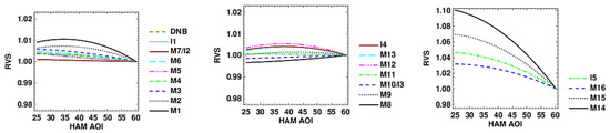 Figure 7 shows the RVS derived from the above analysis for all bands. The bands are divided into subplots based on FPA (VisNIR, SWIR and MWIR, and LWIR). The largest variation of the VisNIR bands is shown by band M1 (a little over 1%), with the remaining VisNIR showing lower variation with increasing wavelength. The SWIR and MWIR RVS are also small, less than 1% variation over the entire AOI range. In contrast, the LWIR RVS showed large variation, up to about 10% for band M14. In general, the magnitudes and RVS shapes are consistent across builds; SNPP and JPSS-1 showed slightly less variation and JPSS-2 was comparable. The results for HAM sides A and B are consistent; this was not the case on some previous builds (notably JPSS-1).