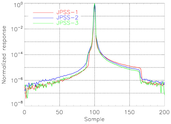The NFR was measured during ambient testing using a collimated source to produce a sharp line image on the detector. The scatter was then measured as the telescope scanned past the source. An example is shown in Figure 8 for band M4, along with comparisons to earlier builds. Note that the response changes rapidly as the telescope approaches and then moves away from the source image. There are two abrupt drops in the response (one on the leading edge and one on the trailing edge of the scan profile) which correspond to the locations of the intermediate field baffle; outside of these locations the profile reaches the noise floor of the measurement. JPSS-3 NFR is generally comparable to earlier builds. A Harvey–Shack model was used to fit the profile in four parts: inside and outside the baffle and leading or trailing side of the image [22]. The resulting fits are then used to convolve the profile with a bright target of 12 mrad by 12 mrad with a radiance defined in Table 9. A sensor design specification limits the amount of scattered light that can enter the detector from some distance outside the bright target, also defined in Table 9. The measured values for the scattered light are listed in this table as well, with all bands meeting the requirement. Note that the values listed in Table 9 are for beginning of life, and may worsen over the coarse of the mission. The JPSS-1 and JPSS-2 assessments are also included for comparison, showing JPSS-3 as good, or better than earlier builds, for most bands.
