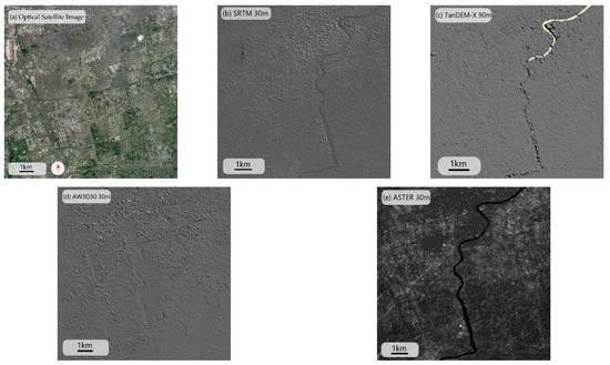 Schematic of the four digital elevation models (DEMs) and an optical satellite image of the Pudong study area (31°N, 121°E) obtained by Google Earth: (a) optical satellite image, (b) SRTM, (c) TanDEM-X, (d) AW3D30, and (e) ASTER.
