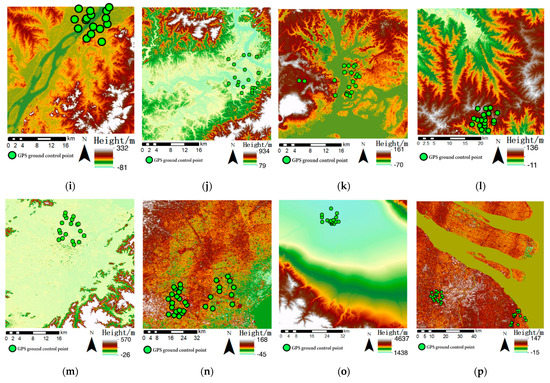 Images showing topographies of the sixteen study areas in China (generated by AW3D30DEM): (a) Fangshan, (b) Yantai 1, (c) Yantai 2, (d) Zhengzhou, (e) Hefei, (f) Chengdu, (g) Wenchang, (h) Wuhan, (i) Nanjing, (j) Ganzhou, (k) Zhanjiang, (l) Weinan, (m) Ningbo, (n) Beichen, (o) Zhangye, and (p) Pudong.