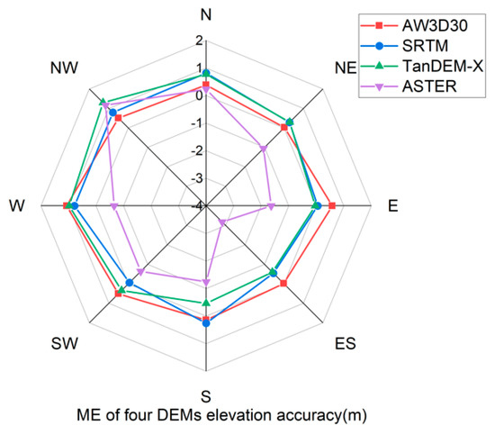 As can be seen from the average error radar plot of the four global DEMs in all study areas according to the slope aspect grade (Figure 5), the radar plots of AW3D30, SRTM, and TanDEM-X are very close to the regular octagon, and all of them fluctuated slightly near the error of 0. The slope aspect had little influence on their vertical accuracy, but it did influence that of ASTER, and this is consistent with the conclusion of the above overall accuracy analysis. The ME value of AW3D30 was the largest at W slope aspect, which was 1.068 m, and the smallest at ES slope aspect, which was −0.014 m. The ME values of other slope aspects fluctuated between 0 and 1 m. In general, these ME values were very small, and there was no significant difference between different slope aspects. Similarly, the ME values of SRTM and TanDEM-X in different slope aspects basically fluctuated between 0 and 1 m. The difference is that SRTM and TanDEM-X both showed opposite ME values on E, SE, and S slopes compared to N, NW, and W slopes. The ME values of SRTM were 0.816, 0.791, and 0.780 m in the N, NW, and W slope aspects, and 0.054, −0.054, and 0.257 m in the E, SE, and S slope aspects. The ME values of TanDEM-X were 0.773, 1.296, and 0.976 m in the N, NW, and W slope aspects, and −0.034, −0.060, and −0.459 m in the E, SE, and E slope aspects. Moreover, both exhibited the highest vertical accuracy on E slopes. Different from the first three DEMs, the ME value of ASTER fluctuated greatly in different slope aspects, with the maximum value of −3.172 m in the SE slope aspect and the minimum value of 0.2350 m in the N aspect, and underestimated the elevation value in other slope aspects, except N and NW.
