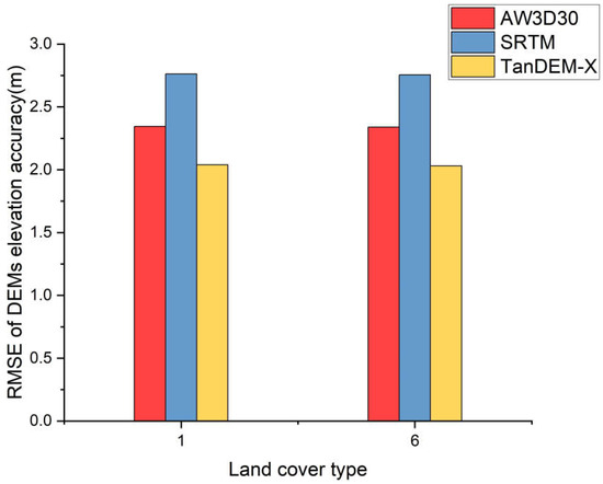 The chosen study areas were located over cultivated land, buildings, and artificial surfaces, so only grades 1 and 6 of the land cover types were analyzed here. Levels 1 and 6 each had little influence on the vertical accuracy of each DEM. It can be seen from Figure 6 that the RMSE values of AW3D30, SRTM, and TanDEM-X were very similar at levels 1 and 6. The RMSE value of AW3D30 was 2.344 and 2.339 m at levels 1 and 6, respectively, that of SRTM was 2.761 and 2.755 m, respectively, and that of TanDEM-X was 2.039 and 2.031 m, respectively. The difference of RMSE values of the three DEMs was also small.