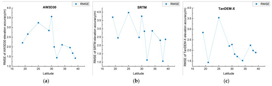RMSE values of the three DEMs with respect to latitude: (a) AW3D30, (b) SRTM, and (c) TanDEM-X.