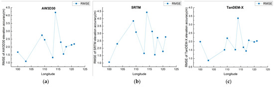 RMSE values of the three DEMs with respect to longitude: (a) AW3D30, (b) SRTM, and (c) TanDEM-X.