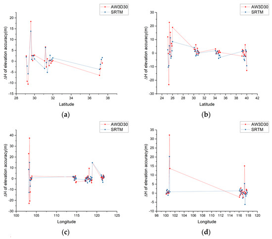 In order to further expand the analysis of the interesting point of longitude and latitude changes, we also selected more reference points in the 16 study areas at an interval of 0.1° and controlled the variables more strictly. Taking the elevation value of the most accurate TanDEM-X 90 m as the reference value, we analyzed the impact of different latitudes along the same longitude on AW3D30 and SRTM, as well as the impact of different longitudes along the same latitude on these two DEMs.