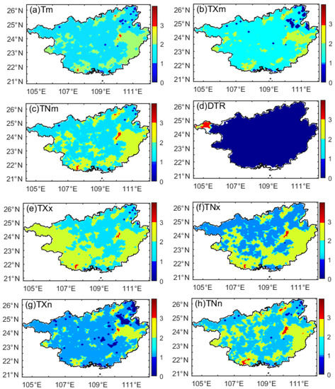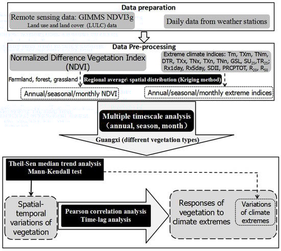 Figure 2 provides the flowchart of the approach of this study. The Expert Team on Climate Change Detection and Indices (ETCCDI) has developed a suite of extreme climate indices, including 16 temperature indices and 11 precipitation indices [47]. Guangxi has a typical subtropical and Asian monsoon climate with generally sufficient rainfall (Figure 1a), and the average temperature in the coldest mouth is above 10 °C. Based on these climate characteristics of Guangxi, this study selected the 16 most relevant indices to reflect the intensity and duration in climate extremes (Table 2). This study also analyzed the mean value of the daily mean temperature (Tm) to supplement the extremes. All climate indices were divided into three categories: annual indices, seasonal indices and monthly indices. All these indices can be calculated on an annual basis and used as annual indices. In addition, the 12 indices (Tm, TXm, TNm, DTR, TXx, TNx, TXn, TNn, Rx1day, Rx5day, SDII and PRCPTOT) can be calculated not only on an annual basis, but also on a seasonal or monthly basis. Thus, the 12 indices can also be used as seasonal and monthly indices by being calculated for corresponding time scales. The kriging method was used to resample the climate data of the meteorological stations to a spatial resolution of 8 km to spatially match the NDVI dataset.