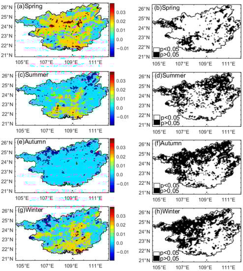 Spatial distributions of the trend rates of the seasonal NDVI (unit: 10 × year−1) (a,c,e,g) and their significant test (b,d,f,h) during 1982–2015.