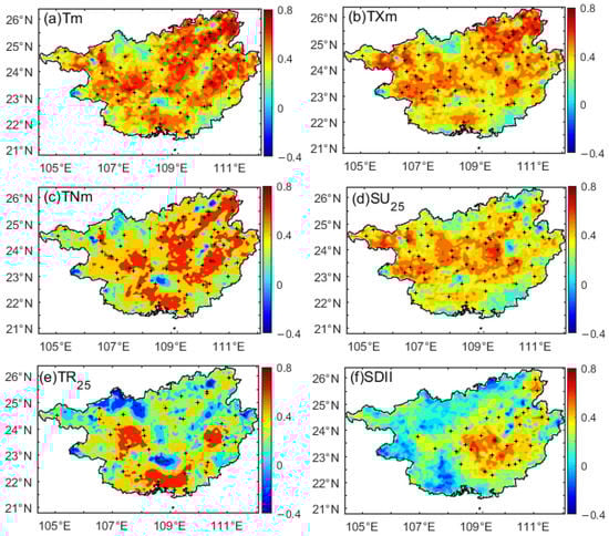 Spatial distributions of the correlation coefficients between the annual NDVI and each temperature extreme index during 1982–2015: (a) Tm; (b) TXm; (c) TNm; (d) SU25; (e) TR25 and (f) SDII. Note: ‘+’ significant at p < 0.05.