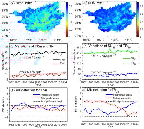 Spatial distributions of the annual NDVI in 1982 (a); spatial distributions of the annual NDVI in 2015 (b); inter-annual variations of TXm and TNm (c); inter-annual variations of SU25 and TR25 (e); the Mann–Kendall (MK) abrupt change detection for TNn (e); and the Mann–Kendall (MK) abrupt change detection for TR25 (f). Note: in (c,d), the solid line represents the observed data, and the dotted line represents the fitted data.