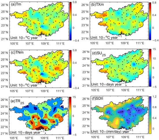 Spatial distributions of the trend rates of the annual climate indices during 1982–2015: (a) TXm, (b) TNm, (c) TXx (unit: 10 × °C year−1); (d) SU25, (e) TR25 (unit: 10 × days year−1) and (f) SDII (unit: 10 × (mm/day) year−1). Note: ‘+’ significant at p < 0.05.