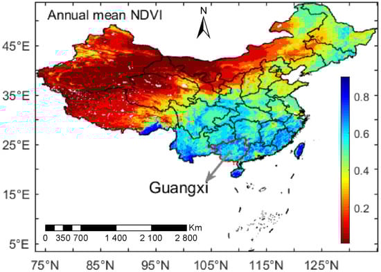 Having a large area and vegetation diversity, China presented large northwest–southeast differences in its vegetation greenness (Figure 11). The multiyear mean of the annual NDVI was mostly around or above 0.5 in southeastern regions in China, such as Guangxi, whereas it was mostly under 0.3 in northwestern China, which has a low vegetation cover rate. As vegetation is a pivotal link between the atmosphere and the land’s surface, the inhomogeneity of vegetation activity can enhance the spatial heterogeneity of the vegetation responses to different climate extremes. Extreme temperature mostly has a very extensive and complex effect on vegetation in China [12,18,25]. High temperature can enhance the evaporation [53] and reduce soil moisture [25,31], which increases the soil drought conditions. Thus, the increasing high temperature may tend to preclude vegetation growth in the north of China [12,18]. Nevertheless, there are relatively flourishing vegetation and abundant precipitation resources in Guangxi, and the abundant precipitation would mitigate the negative effects of increasing high-temperature indices to a certain degree.