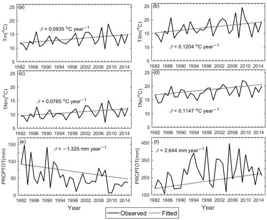 The interannual variation in the monthly climate indices during1982–2015: (a) Tm in February, (b) TXm in February, (c) TNm in February, (d) TNx in February, (e) PRCPTOT in February and (f) PRCPTOT in June. Note: the solid line represents the observed data, and the dotted line represents the fitted data.