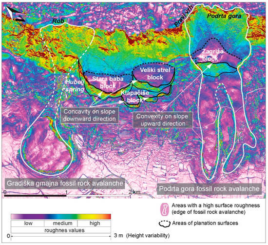The surface roughness is low in the interior of the Podrta gora and Gradiška gmajna fossil rock avalanche. It is particularly low in the central part of the tongue- or fan-shaped areas of the body. Similarly, Glenn et al. [37] recognized the high surface roughness at the head scarp and the toe of rock avalanches. Surface roughness is different in different parts of a single landslide; namely, it is high in the areas of erosion and low in the body of the landslide [36,37].