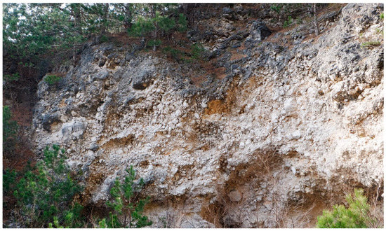 The structural contact is expressed morphologically by the difference in lithology between the steep carbonate rocks in the massif and the gentler slopes of the underlying flysch in the lower part of the slope. This lithologic boundary, formed by the thrust contact, is covered by a variety of Quaternary slope deposits, broadly divided into two groups. The first group is lithified and unlithified scree deposits covering the upper part of the slope, while the second group is partially cemented complex Quaternary slope deposits covering the lower part of the slope. The latter represents a series of composite, fan-shaped sedimentary bodies with different compositions, internal structures, and textures, indicating a complex depositional history and polyphase genesis [4,6,15,16,17]. Quaternary slope deposits are moderately sorted and consist of gravel to medium boulder-sized clasts. Rarely, very large (approximately several meters in a linear direction) individual boulders are also present. In addition, carbonate megablocks reaching more than 100 m in length are found at the lower parts of the slopes (e.g., in the Lokavec area near Ajdovščina). They were detached from the stable carbonate karst plateau and were transported up to 2 km by translational and rotational slope movements [18] (Figure 2).