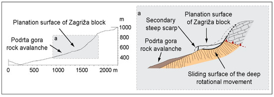 In the upper part of the Podrta gora rock avalanche is a large area of an accumulation of carbonate rocks with low surface roughness, most likely representing a huge rotational block that slid on the weathering flysch bedrock or muddy sediment at its base (Figure 3). The block, which is divided into three parts, consists of strongly cracked carbonate rocks, while carbonate breccias and slope gravels occur only in the hinterland. Similar gravity blocks were recorded near the Lokavec slide in a combination of translational and rotational block-type slope movements [18]. The gravitational block of Podrta gora most likely represented the first transport phase of the complex Podrta gora rock avalanche, from which a huge gravel landslide further developed and was transported in the form of a rock avalanche in the Vipava Valley. The two phases of the Podrta gora rock avalanche mass movement are also evidenced by the forms of the secondary scarp (convexity in the downward direction) in the Zagriža area (Figure 3). The latest proposed classification system by Hungr et al. [54], modified after Varnes [55] and Cruden and Varnes [48], classifies two-phase landslides in the class of complex landslides, and their transport complexity is referred to as a two-phase event [56]. In contrast to the two-phase Podrta gora rock avalanche, the two-phase transport process is not observed in the case of the Gradiška gmajna rock avalanche. The large area of the main scarp and the well-defined upper crown, as well as the large fan-shaped body in the lower part of the avalanche, may indicate that Gradiška gmajna represents a huge rockfall in the initial (first) phase, which further developed into a debris avalanche.