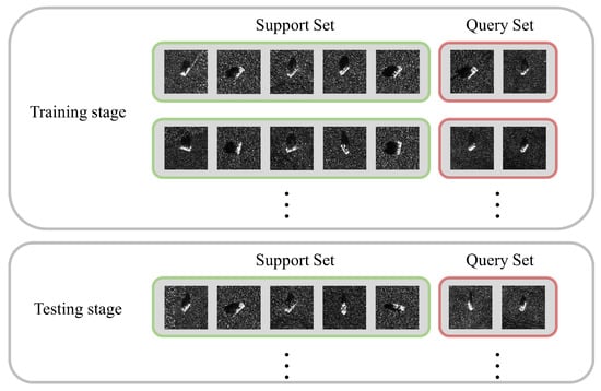 To improve the performance of few-shot learning algorithms, a lot of work has been conducted []. Table 1 shows a summarization of these methods. First, from the image itself, some have tried to teach a classifier under the supervision of different azimuths, sizes, or areas of shadow, etc. [,,,,]. However, due to the different observation angles, there could be parts covered with shadows, which results in black zones in an image. This increases the intra-class difference, making it even harder to extract invariant features. Another attempt is to enlarge the previous datasets using data augmentation [,,]. Either learning a set of geometric transformations [,] or generating samples from other highly correlated datasets could alleviate the shortage of data to a great extent. Still, this kind of method can only work for some specific datasets, and different datasets usually follow different augmentation strategies.