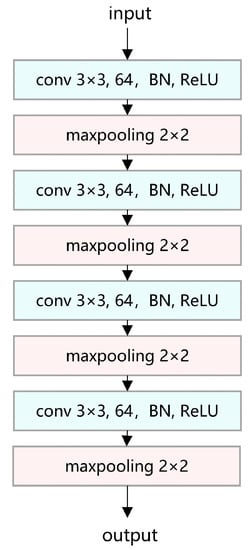 Extracting features from the input images could be an essential part of image processing. The whole backbone architecture is shown in Figure 4. There are four convolutional layers in this structure, each followed by a ReLU activation, a batch normalization, and a max-pooling layer. It maps the input images into a lower and more organized metric space. Here, we use a typical setting of 3 × 3 kernel of a convolutional layer to extract global features. Then, a max-pooling layer with a kernel of 2 × 2 is included to decrease the dimensions of features as well as maintain its information.