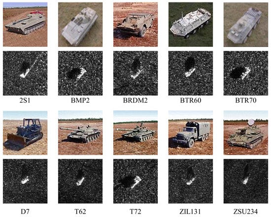 This dataset consists of 10 kinds of vehicles: 2S1, BMP2, BRDM2, BTR60, BTR70, D7, T62, T72, ZIL131, and ZSU234, which include a tank, a freight truck, and so on. It provides a spatial resolution of 0.3 m × 0.3 m and an image size of 128 × 128. Each image is taken on an equal angular interval within 360°, via different depression angles ranging from 15°, 17°, and 30°. Usually, we take a dataset under a depression angle of 15° as the testing set and that of 17° as the training set. Both optical images and SAR images are shown in Figure 5. Following an FSL routine, we randomly select several classes as the training set and several others as the testing set, which is shown in Table 2.