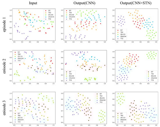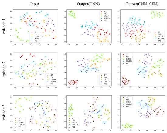 Furthermore, the visualization results of each stage for the five-way five-shot experiments are given in Figure 6, where three images in the left column are the 2D visualization results of input samples. The middle three images visualize outputs of the four-layer CNN, and images in the right column show outputs after coming through the spatial transformer module. Each row of three images shows t-SNE results of three different stages of the same episode in case of intuitively comparison. From this figure, a noticeable improvement in classification results is shown, where there is chaos from the very beginning, relatively well sorted after feature extraction of CNN, and better organized through a final spatial transformation. Note that stars represent samples of the support set, and the rest of the solid circles are for the query set. Each color stands for one class.