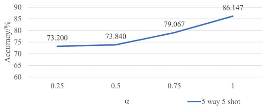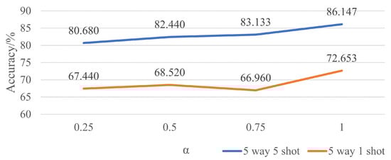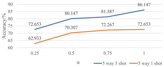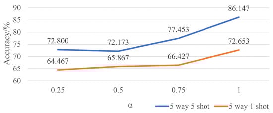 Now, the first to be discussed is the extra loss from an additional softmax layer. Considering the fact that PN classifies images according to their distance toward the class prototypes of the support set, the support set needs to be categorized properly in the first place. To this end, an extra softmax layer is directly added to the branch of support set to tackle with a simultaneous classification. For comparison, there are four values of in both the five-way five-shot and five-way one-shot experiments. Figure 8 shows the final results with different settings. With the increase in , the accuracies of the final classification roughly increase in the meantime, which means that the higher the proportion of , the better the performance will be. Still, won the game.