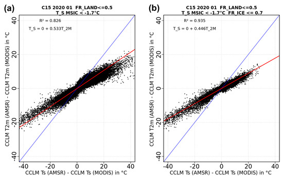Figure 4 shows two examples of these runs for C15 for January 2020 for (a) all ocean grid points with a surface temperature below 1.7 °C and (b) the same but limited to pixels that suffice a 70% SIC-threshold polynya criteria [37,38]. The temperature criterion excludes open water areas. The results show a clear linear relation between the surface temperature differences and the effect on the 2 m temperatures. For the runs in Figure 4a,b, slopes of 0.53 and 0.45 with respective r2 of 0.83 and 0.94 are found, indicating very good correlations. We investigated this relationship also for polynya grid points that require at least seven contiguous polynya grid points (compare Table 2). Since we cover a very large range in differences between CCLM (AMSR) and CCLM (MODIS), we account for a large range of conditions and seasons.