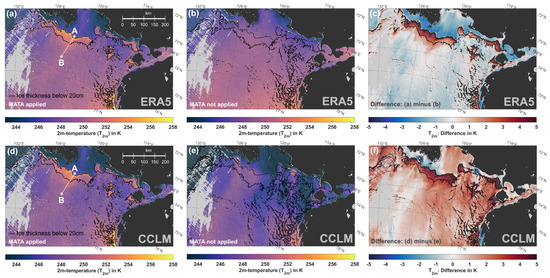 Case study in the Laptev Sea subset-region, showing the total effect of MATA on the 2 m temperature distribution. Panels (a,d) show from ERA5 and CCLM, respectively, with MATA and the correction applied. (b,e) show the respective distributions without an application of MATA, while (c,f) feature the resulting differences in . All displayed values in K for 2 January 2020, 0425UTC. Black contours indicate areas with ice thicknesses up to 0.2 m. Note the data-gaps (in grey) resulting from the omission of temperature values with no corresponding MODIS IST. Points A (74.22°N, 123.09°E) and B (75.16°N, 124.48°E) mark the transect-line for the extraction of various profiles (Figure 7).