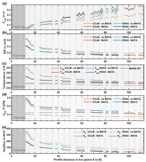 Various profiles (A to B; cf. Figure 6) for sea-ice and atmospheric variables for the case study in the Laptev Sea on 02 January 2020, 04:25UTC (CCLM vs. ERA5; with/without MATA). (a) Calculated thin ice thicknesses (, in m), (b) sea-ice production scaled to one hour (SIP, in cm/h), (c) 2 m air temperatures and MODIS IST (all in K), (d) specific humidity (, in g/kg), and (e) sensible heat flux (in W/m2). Gaps in all panels result from clouds or otherwise missing IST data.