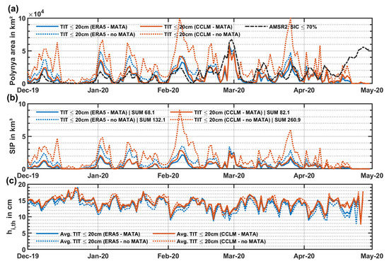 Laptev Sea: (a) Daily polynya area (POLA, in km2), (b) accumulated sea-ice production (SIP, in km3) and (c) average thin-ice thickness (, in cm) between December 2019 and April 2020. Both CCLM and ERA5 are compared (based on PLF daily composites), with and without the application of MATA.