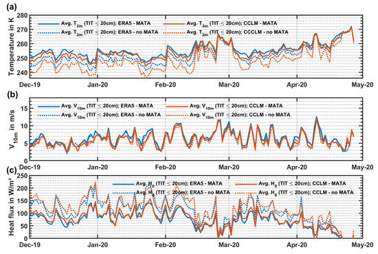 Laptev Sea: Daily averages of (a) 2 m temperatures (in K), (b) 10m wind speeds (in m/s) and (c) the sensible heat flux (in W/m2) between December 2019 and April 2020. Both CCLM and ERA5 are compared (based on PLF daily composites), with and without the application of MATA.