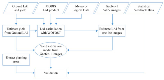 The remainder of the work is organized as follows. Section 2 introduces the study area, data, research framework, and critical models for LAI assimilation and plant extraction. Section 3 presents the experimental results of ground observation and continuous ground LAI fusion, and the yield prediction model is regressively built with vegetation indices from Gaofen-1 satellite images. The proposed model is verified in Section 4 where the performance is discussed, too. The conclusions are given in Section 5.