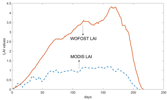 MODIS provides the LAI product. Unfortunately, previous work [41] shows that MODIS LAI tend to be underestimated than measured during the growing season of crops. This is due to the 500 m ground resolution of the MODIS image being too low to account for the pure pixels of crops. Remotely-sensed LAI must be corrected, approaching to ground-measured LAI.