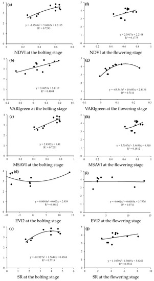 - The vegetable indices are calculated separately using the equations in Table 4, including SR at the bolting stage and VARIgreen at the flowering stage.
