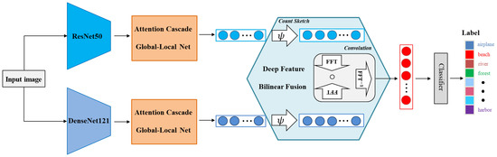 Complex background and large scale difference in remote sensing scene images bring some difficulties to scene classification. In order to address this problem, we propose a dual-model deep architecture based on an attention cascade global–local net (ACGLNet). Although the CNN-based method achieves excellent results in scene classification tasks, the feature extraction capability of a single CNN model is limited, which drives us to develop a dual-model structure. The dual models, which are implemented as ResNet50 and DenseNet121 can extract complementary features. By simultaneously considering both global and local features, we design ACGLNet, which depresses redundant background information by spatial attention and fully integrates the low-level features into the high-level ones according to the top-down feature pyramid. Furthermore, to improve the discrimination of the fused features, we develop a bilinear fusion strategy for fusing the deep features of the dual models, where each element in the two eigenvectors is fused by production. This strategy fully utilizes the correlation between the eigenvectors and extracts refined features from the dual models.