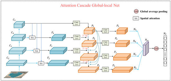 Since remote images are complicated in the background and the key objects are easily scattered, accurate scene classification should consider both global and local features, which may correspond to the high-level and low-level features, respectively. The low-level features contain the details of spatial structures, which remedy the losed spatial information in high-level features. Meanwhile, the high-level features may contain redundant background information, which interferes with the location of targets. By taking the advantages of both types of features, therefore, we propose a novel ACGLNet based on the pyramid structure [44], where the structure is illustrated in Figure 3. The higher-level features are used to generate the spatial attention map, which adaptively assigns weights to the corresponding locations of the lower-level features, depressing the irrelevant information of background. After fusing the weighted low-level and high-level features from the top to bottom through the pyramid, we add cross-scale cascade to obtain multiscale features with rich spatial and semantic information. Finally, we average the multiscale features to get the final output. In this way, the useful features in the input image are expected to be fully extracted while the information loss is minimized.