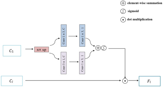 The spatial attention module is to enable the model to locate the region of interest in the input scene images while suppressing redundant noise interference [45]. The structure is shown in Figure 4. To exploit the attention strategy from high-level features, we establish a feature pyramid based on the features of the CNNs in four different scales, which are denoted as }. We first upsample the feature map by n times (n = 2, 4, 8) to match the size of each low-level feature map. Then, we apply two convolutional kernels with the sizes of and to extract semantic information from the previous stage. Two feature mappings are summed and then passed through a sigmoid function to produce a normalized spatial attention map with the size of , where H and W are the height and weight of the feature map, respectively. At last, the spatial attention map generated by the higher-level feature map is directly applied to the adjacent lower-level feature map, where the formula is expressed as: , l = 2, 3, 4, where represents the spatial attention map created by , denotes the low-level feature maps, and is the weighted low-level features with spatial attention.