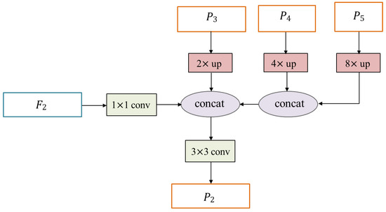 Based on the definition of the feature pyramid module, we can get , where denotes the weighted feature map with spatial attention. These four feature maps with different scales are first processed according to the architecture in Figure 3, generating the feature maps . We double the size of each via upsampling, leading to the feature map with the same size as . Then, is obtained by concatenating the upsampled feature map and . In this way, the generated have the same size as , respectively. All the feature maps are fused by a cross-layer cascade operation, which creates a mapping from the high-level feature maps to the low-level feature maps such that the semantic information for discrimination is improved. By this manner, a direct feature mapping from low-level features to high-level features is established. Figure 5 presents the procedure of cross-scale cascade.