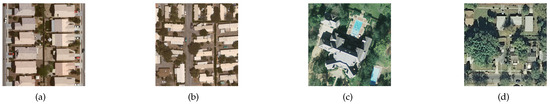 The misclassified images from the dense residential and the sparse residential classes. (a) The image of dense residential. (b) The image of mobile homepark misclassified as dense residential. (c) The image of sparse residential. (d) The image of medium residential misclassified as sparse residential.