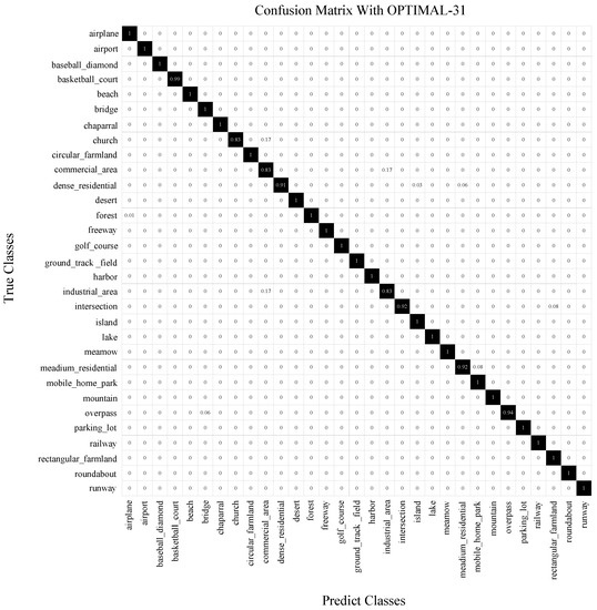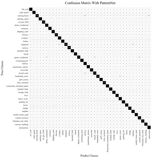 The corresponding confusion matrix on the PatternNet dataset is presented in Figure 10. Of the scene categories, 34 of the 38, reach an accuracy higher than 99%, and most of the scene categories can be fully identified. The most confusing class, i.e., sparse residential, reaches 95% accuracy, which is still a high performance.
