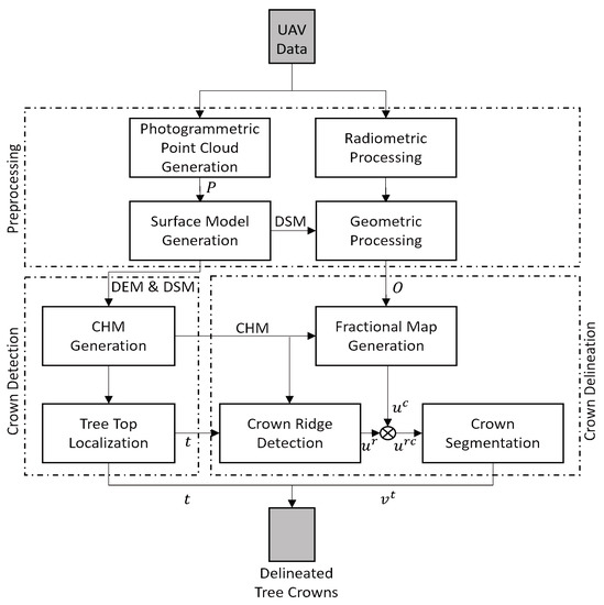 where p is the normalized raw DN number, is the normalized dark pixel value, , and are the radiometric calibration coefficients, is the exposure time, g is the sensor gain, is the pixel coordinate set, and L is the radiance. The reflectance conversion is performed by multiplying the radiance image by a scaling factor that is determined by measuring the radiance of a surface with known reflectance [12]. In this study, the radiometric processing to convert raw digital numbers (DN) to radiance and then to reflectance is performed in the AgiSoft Metashape Professional commercial software (version 1.5.5) using the radiance derived from a 61% reflectance panel that is imaged right before the data acquisition [12,37]. The reflectance (i.e., radiometrically corrected) images are also geometrically preprocessed to (a) estimate the camera and sensor orientation at the imaging instance, (b) determine the 3D crown geometric models from images, and (c) remove spatial distortions in the images. We perform all the geometric preprocessing steps using the Agisoft Metashape Professional commercial software for its excellent performance in feature detection, tie-point matching, and photo-based 3D reconstruction using the structure from motion (SfM) photogrammetric technique [38]. The camera and the sensor orientation parameters required for the image alignment and sparse point cloud generation were estimated using Agisoft with high accuracy by selecting 40,000 and 4000 key and tie points, respectively. An automatic outlier removal is performed on the sparse 3D cloud by removing 10% of the points with the largest reprojection errors. The alignment and location errors were estimated based on 14 widely spaced control points, for which the accurate geographic location is collected using the Trimble Geo XT GPS (Trimble Inc., Sunnyvale, CA, USA). A 3D dense point cloud representing the 3D canopy structure and underlying ground topography was generated with the quality attribute set to medium. The dense point cloud data are used to derive the digital surface model (DSM) and digital elevation model (DEM) that represent the crown surface geometry and underlying Earth surface geometry, respectively [39]. The canopy height model (CHM) representing the local tree canopy height is obtained by subtracting the DEM from the DSM. Effects of canopy/ground surface relief on the reflectance images are compensated for by performing orthorectification using the DSM. The output of the geometric processing is referred to as the image orthomosaic, where all crown geometric distortions are minimized, if not removed, for the individual trees.