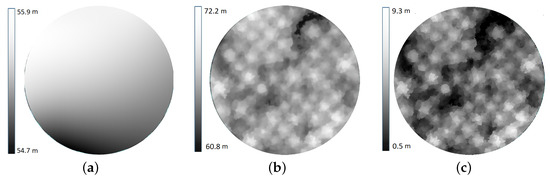 The digital elevation model (a) representing the ground surface height is subtracted from the digital surface model (b) representing the canopy surface height to derive the canopy height model (c) representing the real height of canopy in meters.